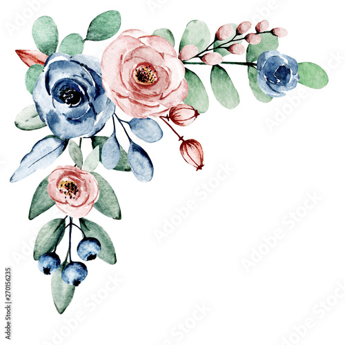 Watercolor Indigo And Dusty Pink Flowers Roses Floral Clip Art Perfectly For Printing Design On Invitation Card Wall Art And Other Isolated On White Background Buy This Stock Illustration And Explore