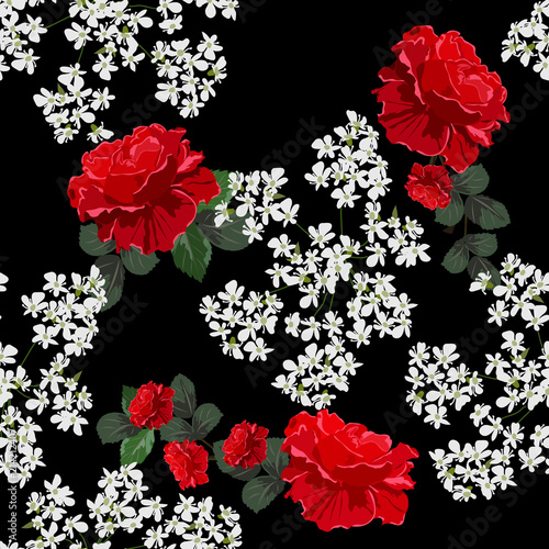 Seamless Background With Beetifully Red Roses And Small White Flowers Design For Cloth Wallpaper Gift Wrapping Print For Silk Calico And Home Textiles Vintage Natural Pattern Buy This Stock Vector And Explore